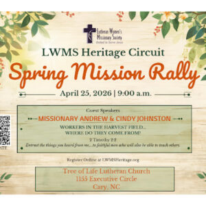 Join the ladies of the Heritage Circuit of the Lutheran Women’s Missionary Society as they gather in Cary, NC for their spring rally.
